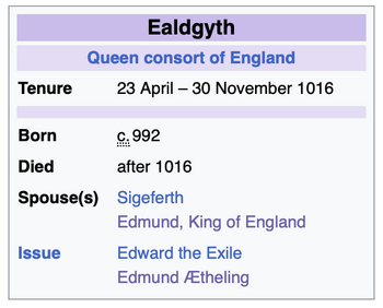 It is generally, but not universally, supposed that Ealdgyth, if that was her name, was the mother of Edmund Ironside's sons. These were Edmund, who died young in exile, and Edward the Exile, who returned to England late in the reign of his uncle King Edward the Confessor and died soon afterwards. Whether she went into exile with her children following Edmund's death in 1016 is unknown.