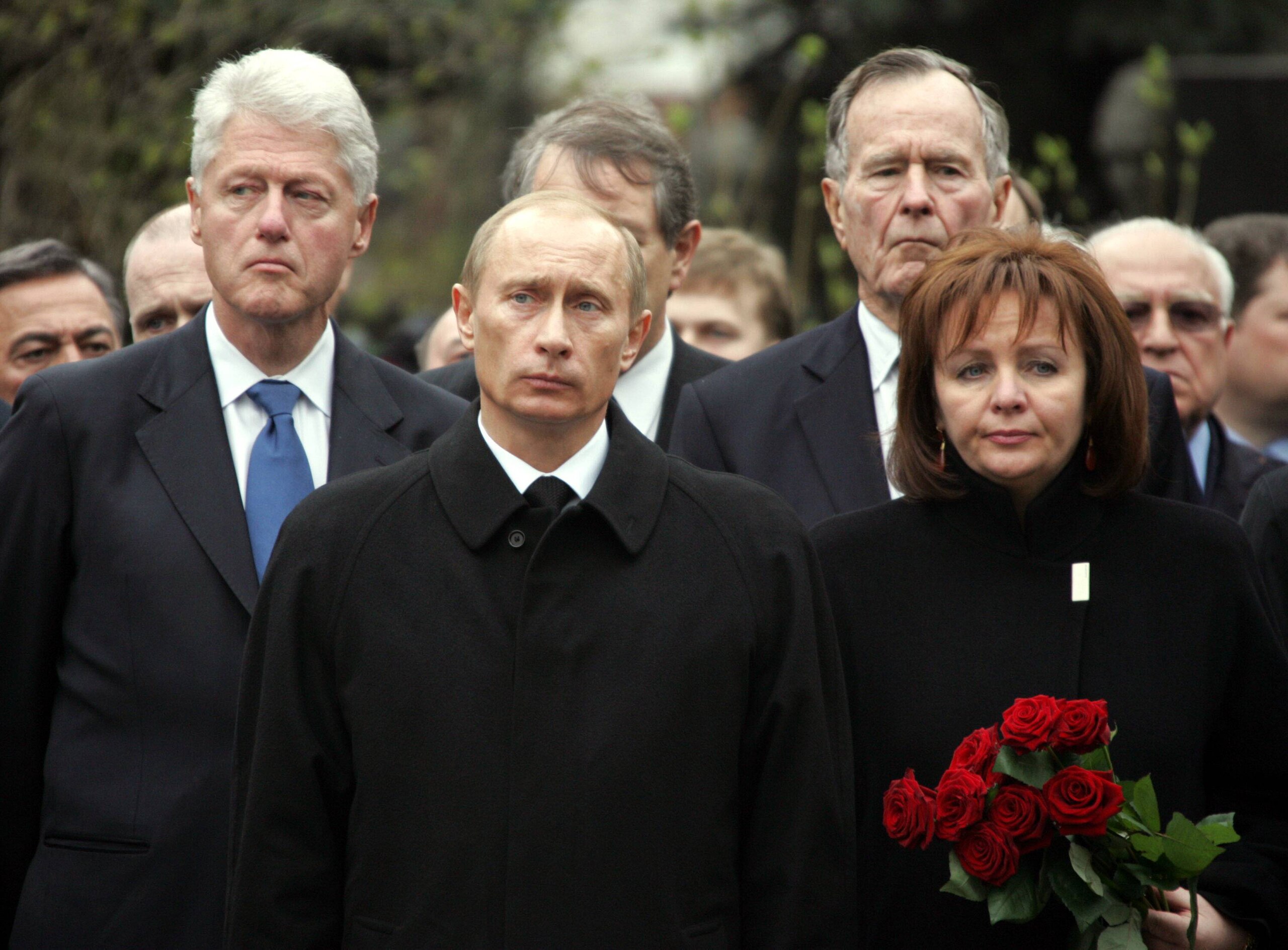Bill Clinton, Vladimir Putin, his wife Ludmila Putina, and George H. W. Bush at the state funeral of Boris Yeltsin on 23 April 2007