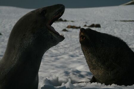 Leopard seal with a male Antarctic fur seal (right) on the shores of Livingston Island. Juvenile fur seals may be preyed upon by leopard seals.